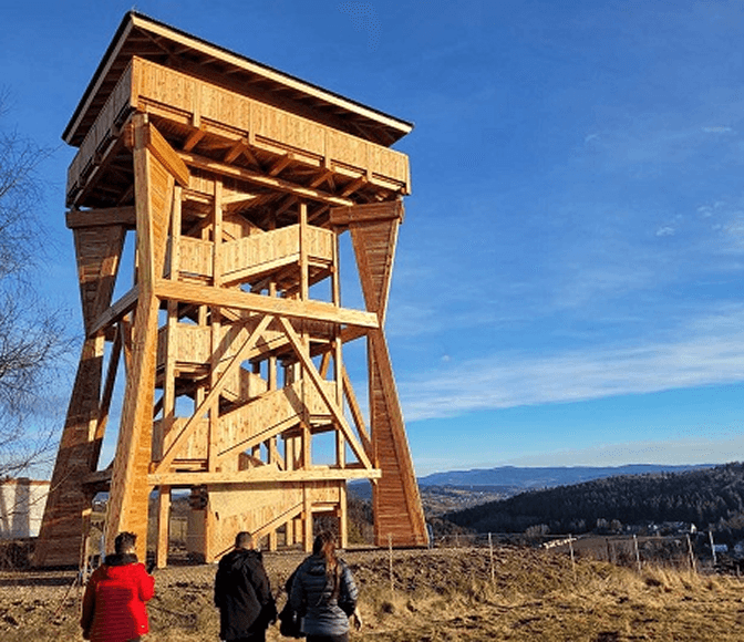 Z tarasu wieży można podziwiać szeroką panoramę, a osoby z lękiem wysokości nie powinny się obawiać – konstrukcja jest solidna i zabudowana. U jej podnóży znajduje się polana, idealna na odpoczynek z widokiem na szczyty. Można też kontynuować spacer grzbietem, ciesząc się otwartą przestrzenią i pięknymi widokami.